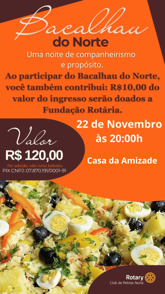 Além de saborear um delicioso bacalhau, você ainda contribui com a Fundação Rotária — parte do valor do ingresso será destinada a apoiar projetos transformadores.