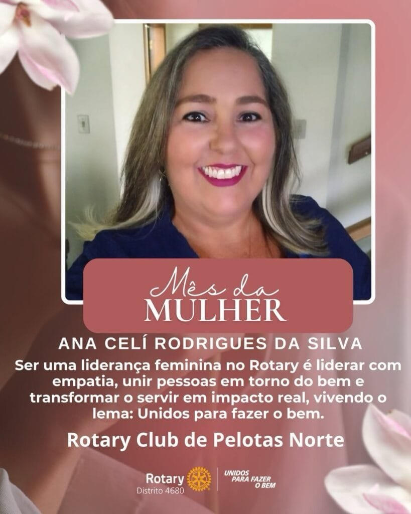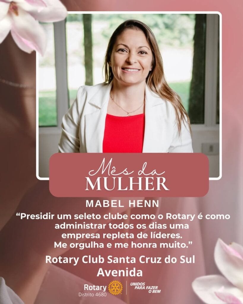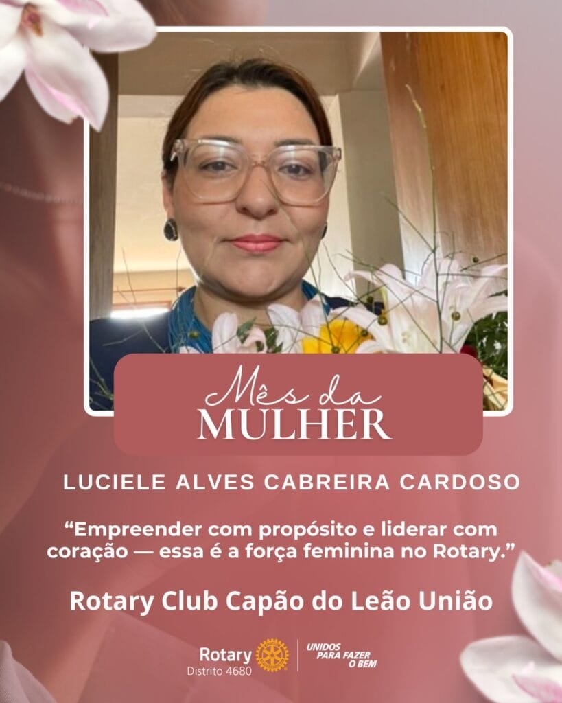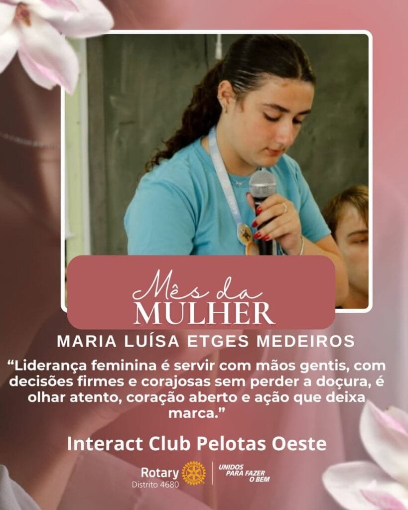 Para celebrar o Dia Internacional da Mulher, o Distrito 4680 de Rotary International promoveu a ação Lideranças Femininas que Inspiram. A iniciativa convidou presidentes de clubes, governadoras assistentes e representantes distritais de Interact e Rotaract a compartilhar uma foto e uma frase sobre o significado de ser uma liderança feminina no Rotary International. O projeto valoriza o protagonismo das mulheres e destaca lideranças que inspiram e fortalecem o impacto do servir em nossas comunidades.